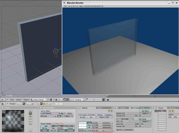 Бізді қоршаған кейбір заттар мен дүниелер түссіз болып та кездеседі. Мысалы, су, әйнек. Көптеген графикалық бағдарламалардағы сияқты Blender-деде нысанның түссіздігін көрсететін Alpha қасиеті бар. Material панеліндегі Alpha қозғалтқышын қозғалту арқылы материалдағы түсті азайтамыз. Ал мөлдір түссіз болуын Mirror Transp панеліндегі Ray Transp батырмасы арқылы немесе Links and Pipeline панелінен ZTransp құралын пайдалану арқылы орындаймыз. (3.6.3-сурет).
