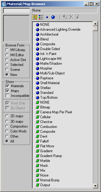 Әр материалда өзінің шейдер әдісі бар. Шейдер типі материал өңдеуіне өзіндік сипаттама береді. Мысалы, Metal (металл) шейдері ерекшеленген материал типін металлға ұқсас етіп жасайды. Материалдың бастапқы типі Standard болады. Оны өзгерту үшін Get Material батырмасын (3.6.6-сурет) басып және Material /Map Browser терезесінен (3.6.7-сурет) керекті материалды таңдаймыз.