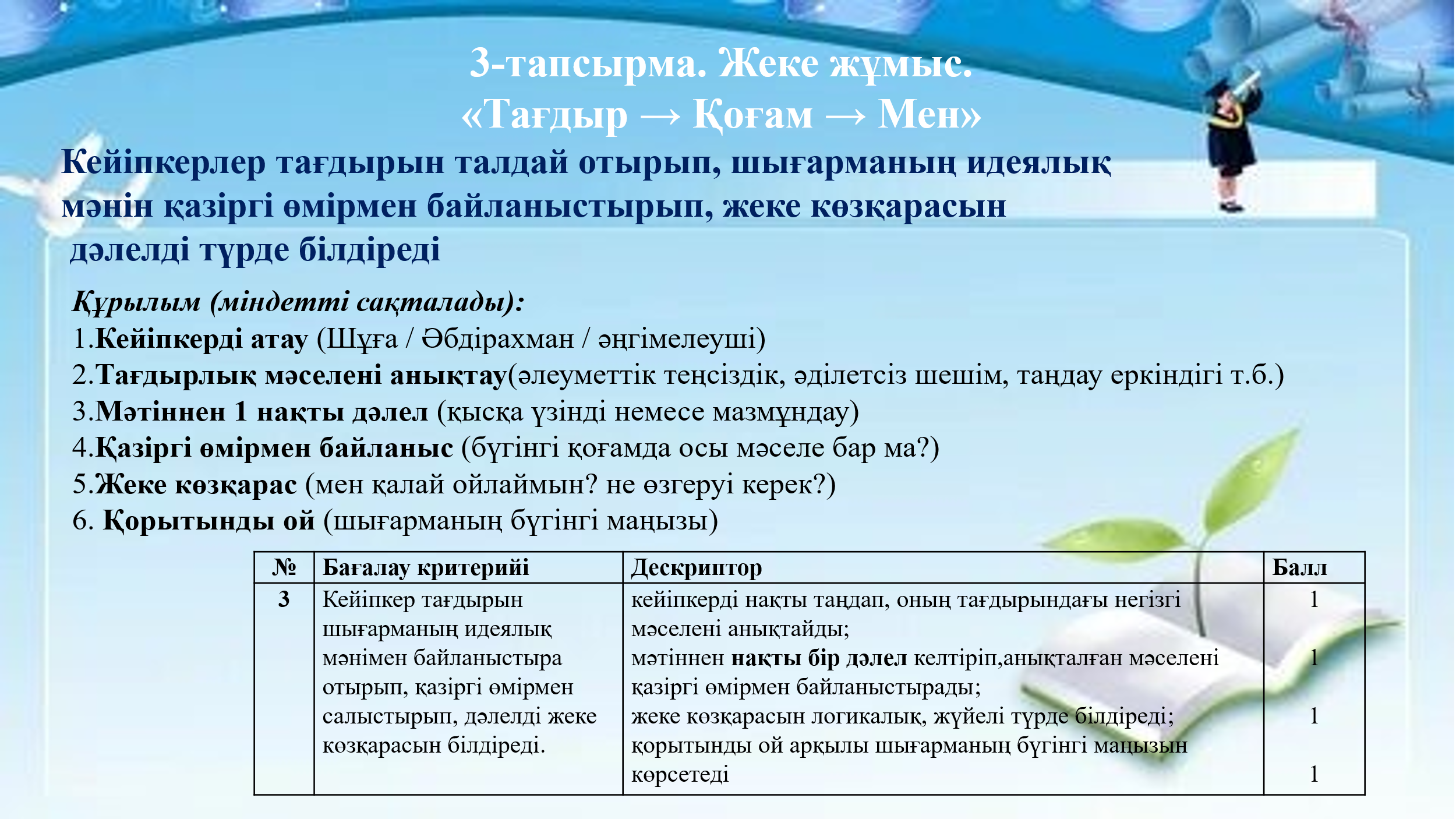 3-тапсырма. Жеке жұмыс. «Тағдыр → Қоғам → Мен» Кейіпкерлер тағдырын талдай отырып, шығарманың идеялық мәнін қазіргі өмірмен байланыстырып, жеке көзқарасын дәлелді түрде білдіреді