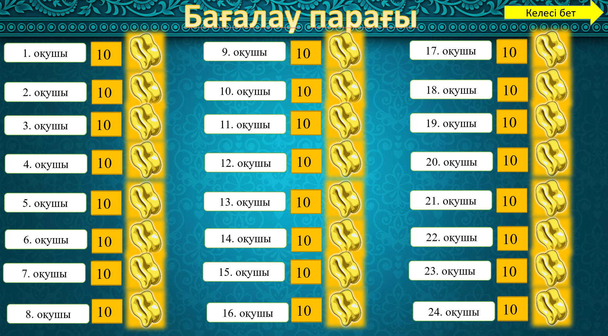 Бағалау: әр тапсырма соңында дескрипторлар- ға сәйкес асық таратып береді. Сабақ соңында оқушылардың асықтарын санайды. |