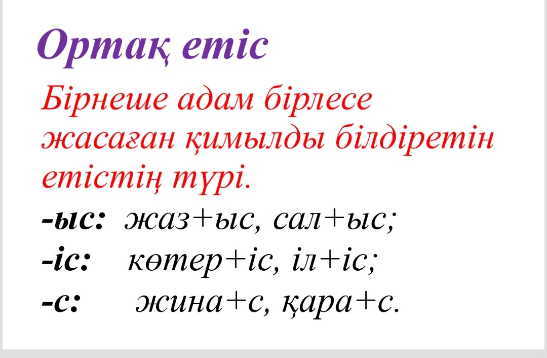 ЕСКЕРТУ!!! Спортшылар жарысқа кетті. Спортшылар жарысты. Бірде, етістік категориясын, бірде зат есім тұлғасында тұратынын айтады. Яғни омоним сөз болады. 4-тапсырма. Мәтіндегі етістіктерді ортақ етіске айналдырып жазыңдар. Айнал, сана, жи, тап, жұдырықта, көр. Дескриптор: ✓ етістіктерді ортақ етіске айналдырады; ✓ ерекшелігін таниды; ✓ сабақта белсенділік танытады. |