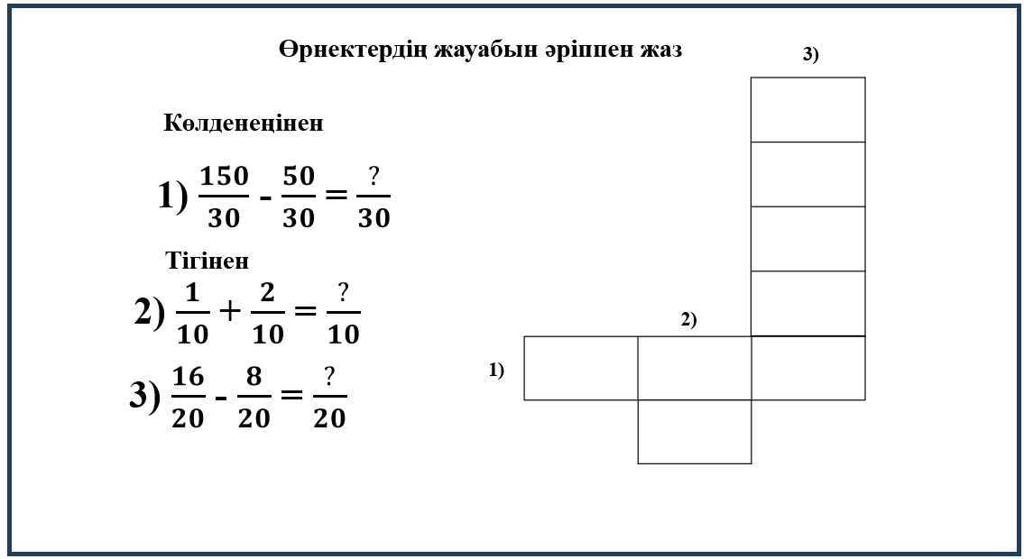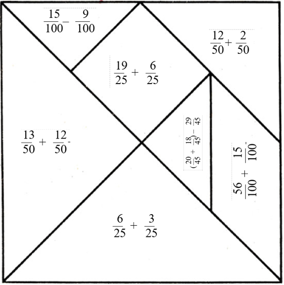 Дескриптор Бөлшектерді қосу және азайтуға берілген өрнектерді шығарады. Танграм бөлшектерін бояйды. Бөлшектерден ұшақ құрастырады. 3 балл