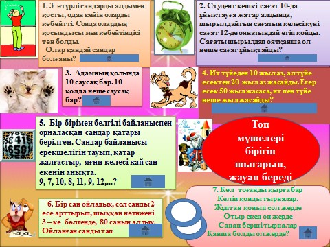 дұрыс, бұрыс, бұрыс, аралас, дұрыс, аралас, дұрыс, бұрыс, аралас. Ойыннан соң оқушыларға өткен сабақтан сұрақтар қою: А) сөзжұмбақ шешу Б) Өздік жұмыс Берілген тапсырмаларды орындап соңында шығатын сөзді табу керек. Тапсырманы орындап болғаннан соң, жауабын жауаптар қатарынан іздеп, тапсырмамен ортақ тұрған әріпті алады.