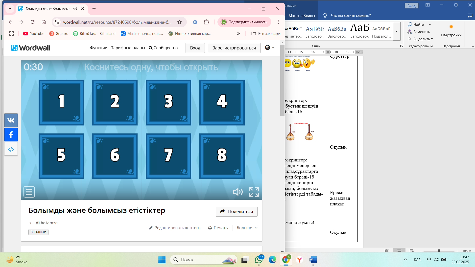 Дескриптор: Шашылған бөлшектерді (пазылдарды) дұрыс құрастырады-1б Мақалды оқиды-1б Тамаша жұмыс орындадыңдар! Дескриптор: Болымсыз етістіктерді ажырата алады-1б Дескриптор: Сызба бойынша сипаттау мәтінін құрап жазады-1б «Білім сандығы» әдісі |