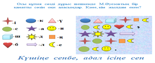 QR код арқылы ақынның суретін көреді Тапсырманы орындйды Өлеңнің авторын атап, ол туралы білетінін айтады. Өлеңнің жалғасын айтып көреді. Өлеңді көшіріп жазады. Болымсыз етістіктердің астын сызады Ұлттық ою орнекке билейді Жұптық жұмыс жасайды Болымды және болымсыз етістіктерді ажыратады Мақалды жаттайды. Оның мағынасын бір-біріне түсіндіреді. Шашылған бөлшектерді (пазлдарды) дұрыс құрастырып, мақалды оқиды.