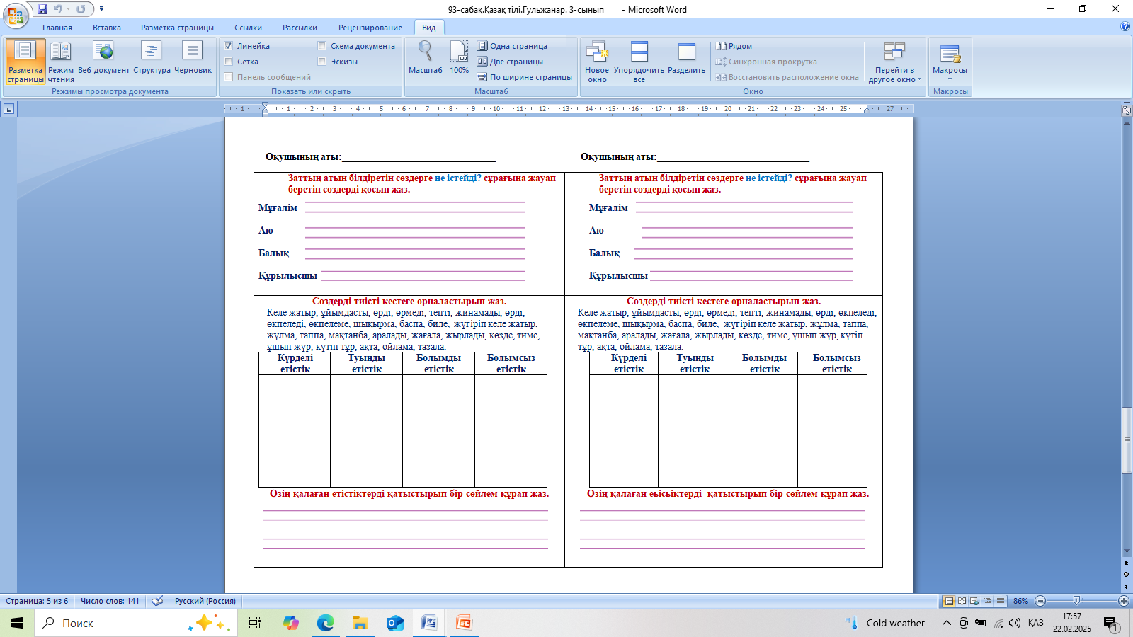 Дескриптор: Сөздерді тиісті кестеге орналастырып жазады-1б Көп нүктенің орнына тиісті етістіктерді қойып жазады -1б