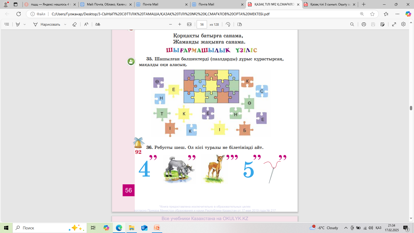 «Шығармашылық жұмыс» 35-жаттығу Шашылған бөлшектерді (пазлдарды) дұрыс құрастырсаң, мақалды оқи аласың.
