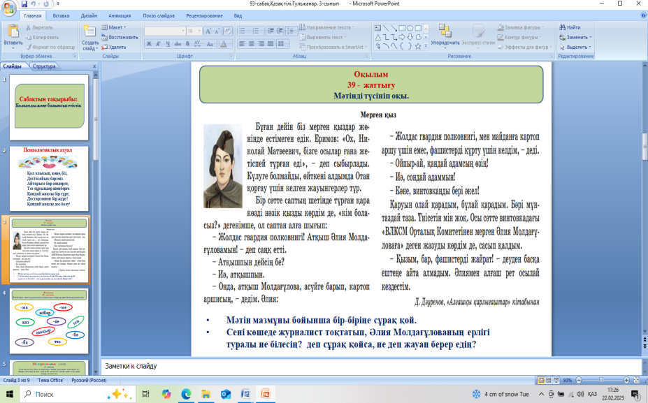 Мәтінді оқы. Сұрақтарға жауап береді. Мәтіннен тірек сөздерді табады.