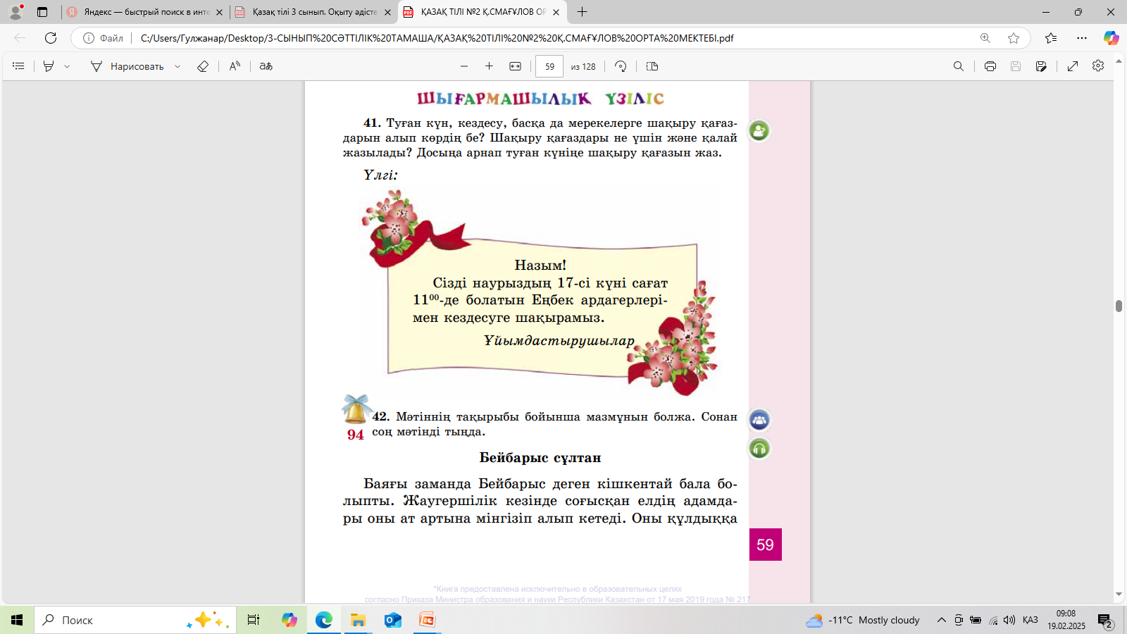 Шығармашылық тапсырма 41 – жаттығу Туған күн, кездесу, басқа да мерекелерге шақыру қағаздарын алып көрдің бе? Шақыру қағаздары не үшін және қалай жазылады? Досыңа арнап туған күніңе шақыру қағазын жаз.