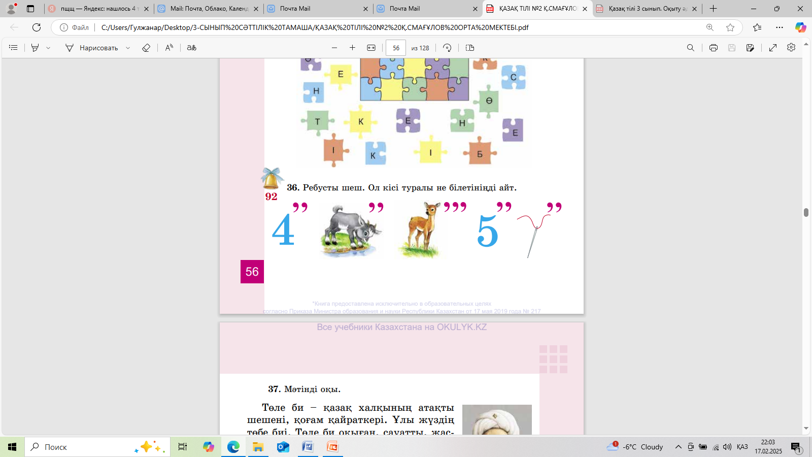 Пазл құрастырады. Мақалды оқиды..