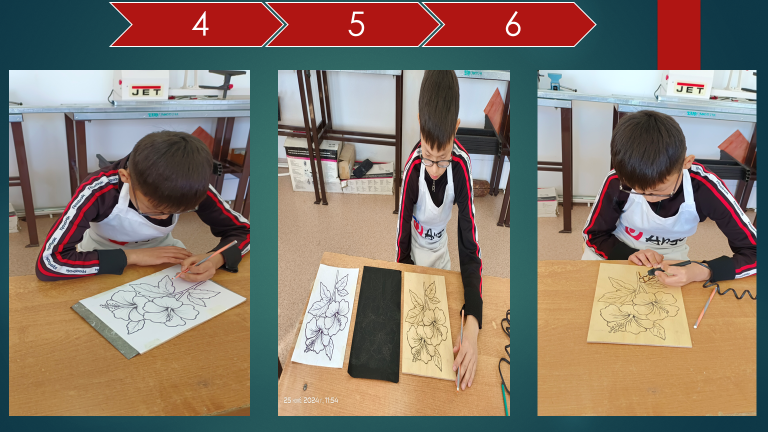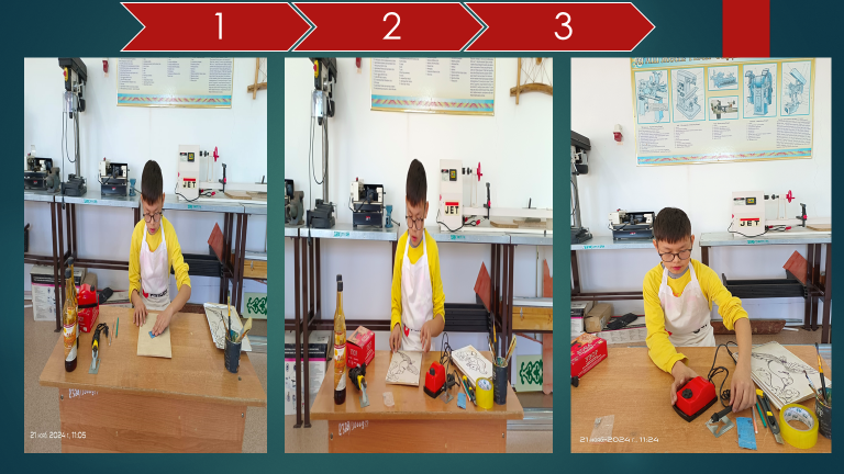 Сұрақтарға толық жауап берілген соң жаңа тақырыпты ашу үшін оқушылардан күйдірудің келесі қадамдарын сұраймын. Ағашқа күйдіріп сурет салудың теориялық білімдерімізді , бүгінгі сабағымызда практика жүзінде орындаймыз. Сонымен бүгінгі сабағымыздың тақырыбы : «Бұйымды көркемдеп күйдіру. Безендіру» Сабағымыздың мақсаты: - Бұйымдардың функционалдық және эстетикалық сапасын арттыру үшін материалдарды механикалық өңдеу және бұйымды безендіру -Шығармашылық жұмыстар мен бұйымдар жасау барысында қазақ ұлттық мәдениет элементтерін пайдалану
