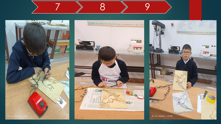 «Ағашқа көркемдеп күйдіру» тақырыбы бойынша «Сыйқырлы кітапхана» сұрақ- жауап әдісі арқылы оқушылар өткен сабақтарда алған теориялық білімдерін пысықтайды
