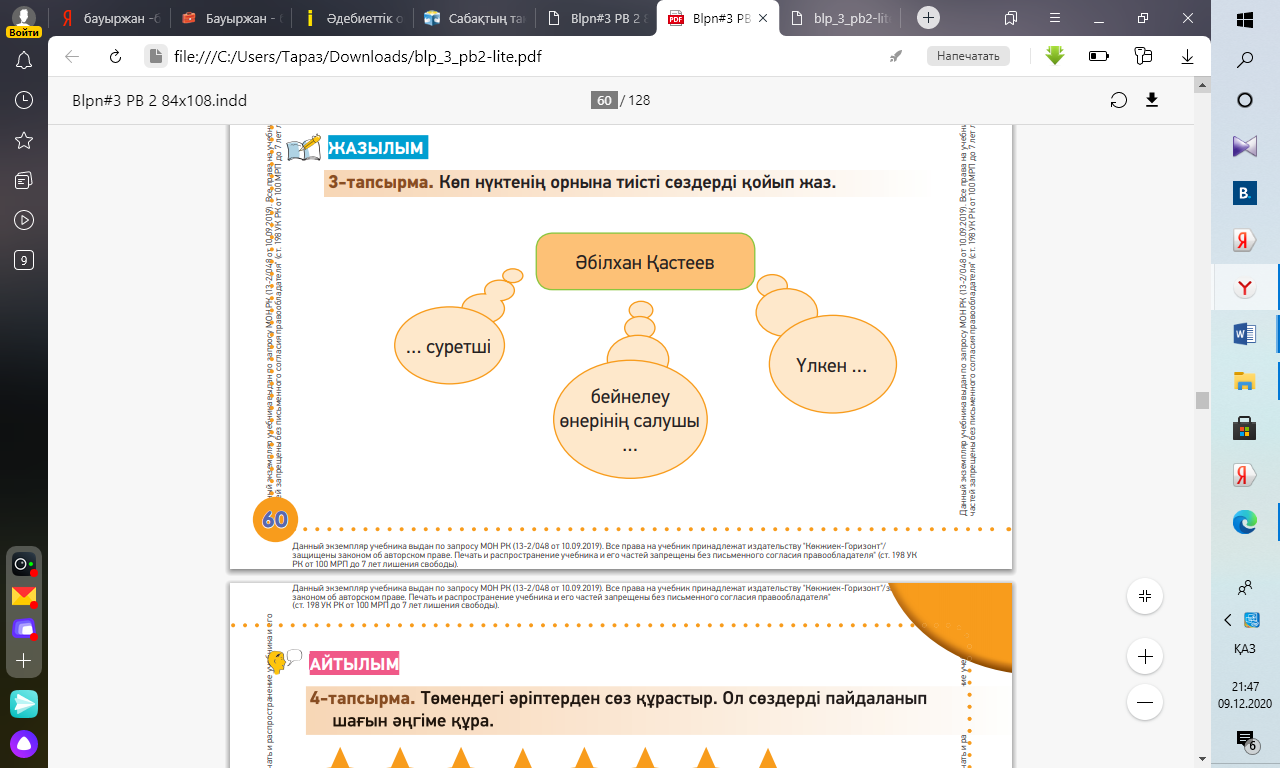 2. Мәтін бойынша сұрақтарғ жауап береді. Әбілхан Қастеев кім? Ол кісі туралы не білесің? Ә.Қастеевтің қандай туындысы бар? 3.Оқылым.Айтылым. Сұрақтарға жауап береді: Диалог кімдер арасында жүріп жатыр? Анасы Әлиге не айтты? Әли анасына не айтты? Әлиге суретшінің қай туындысы ерекше ұнады? 2. Мәтін ішінен жіктеу есімдігінің септеулі түрін табады. «Мен» есімдігін басқа септіктер бойынша ауызша түрлендіріп шығады. 3-тапсырма Көп нүктенің орнына тиісті сөздерді қойып жазады. |