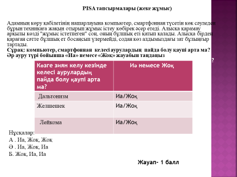 PISA тапсырмалары (ЖЖ) Адамның көру қабілетінің нашарлауына компьютер, смартфоннан түсетін көк сәуледен бұрын техникаға жақын отырып жұмыс істеу көбірек әсер етеді. Алысқа қарамау арқылы көзді "жұмыс істетпеген" соң, оның бұлшық еті қатып қалады. Алысқа бірден қараған сәтте бұлшық ет босаңсып үлермейді, содан көз алдымыздағы зат бұлыңғыр тартады. Сұрақ: компьютер, смартфоннан келесі аурулардың пайда болу қаупі арта ма? Әр ауру түрі бойынша «Иа» немесе «Жоқ» жауабын таңдаңыз