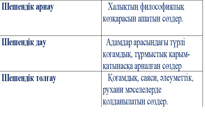 1. Оқушылармен амандасу, түгендеу. 2. Ынтымақтастық атмосферасын қалыптастыру «жылы жүрек лебізі» 3. «Сәйкестендір» әд.арқылы өтілген тақырыпты қайталау. 1.Шешендік арнау 2.Шешендік дау 3.Шешендік толғау 3.Халықтың философиялық көзқарасын ашатын сөздер. 2. Қоғамдық, саяси, әлеуметтік, рухани мәселелерде қолданылатын сөздер. 1.Адамдар арасындағы түрлі қоғамдық, тұрмыстық қарым-қатынасқа арналған сөздер. |