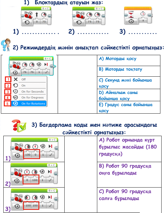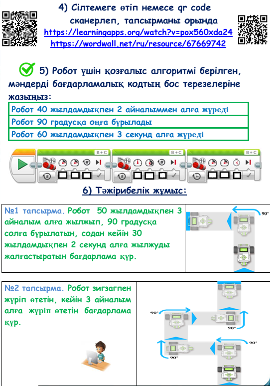 Жаңа ақпаратпен танысады, тапсырманы орындайды Дескриптор: - блоктардың атауын жазады - сәйкестікті белгілейді - бағдарлама коды мен нәтижесі арасында сәйкестікті белгілейді Сергіту жаттығуларын орындайды - интерактивті тапсырмаларды орындайды - бос орындарға мәндерді жазады - роботқа арналған бағдарлама құрады |