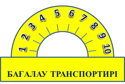 Оқушылар бүгінгі сабақ бойынша өздерін бағалайды Ауызша сұрақтар қою арқылы бүгінгі сабаққа баға беру Мұғалім оқушыларды «Транспортир» әдісі арқылы бағалайды. |