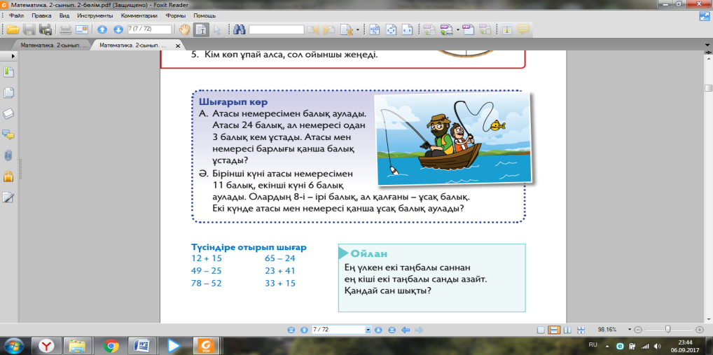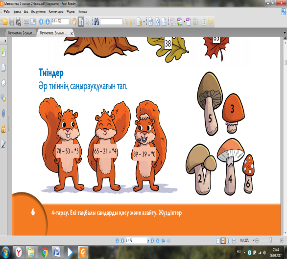 Талдау Дәптермен , тақтамен жұмыс Оқулықта берілген есептерді түріне қарай топта, жұпта, жеке орындату. Тапсырмалар орындау соңында кері байланыс орнату. Оқушылардың тапсырманы орындау деңгейіне сай бағалап отыру. |