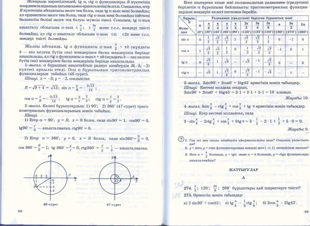 № 370 №371 №372 есептер шығару Дескриптор: Кез-келген а бұрышының синус, косинус, тангенс, котангенс мәндерін анықтайды. Бірлік шеңберді қолдана алады. |