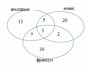 №2. Шет елге баратын 100 туристің 30 – ы неміс тілін, 28 – і ағылшын тілін, 42 – і француз тілін, 8 – ағылшын және неміс тілдерін, 10 – ы ағылшын және француз тілдерін, 5 – уі неміс және француз тілдерін, 3 – уі үш тілді де біледі. Неше турист бірде – бір тілді білмейді? Шешімі: