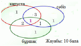 Оқушылар дәптерлерін өзінен кейінгі оқушыға жалғап, «карусель» әдісімен бағалайды. Жеке жұмыс №1. Эйлер-Венн дөңгелектерін пайдаланыңыз. Қалада көп балалы жанұя тұрады. 7 бала капустаны, 6 – сәбізді, 5 – бұршақты, 4 – капуста және сәбізді, 3 - капуста және бұршақты, 2 – сәбіз және бұршақты, 1 – капуста, сәбіз және бұршақты жақсы көреді. Жанұяда неше бала? Шешімі: