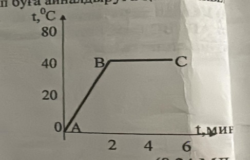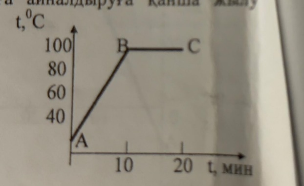 Графикте массасы 500 г сұйықты қыздырып буға айналдыру процесі көрсетілген а) Заттың булану температурасын табыңыздар б) АВ және ВС бөлігіндегі заттың қандай күйіне сәйкес келеді?