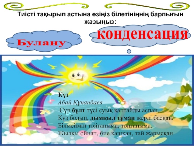 Оқушылар А.Құнанбаевтың Күз атты өлең шумағынан күзді бейнелейтін сөздерді табады. Күтілетін жауап: Бұлт, Тұман сөздерін атайды.