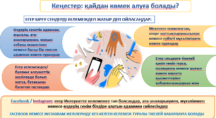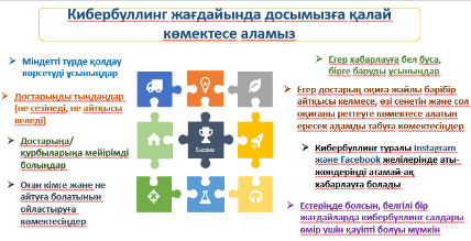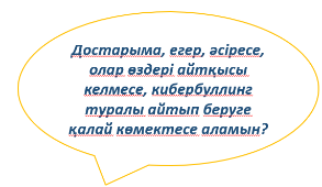 1 Кейде бізге жақын адамдар кибербуллингке тап болуы мүмкін. Олар достарымыз немесе туыстарымыз болуы мүмкін. Оларға көмектесуге бола ма, көмектесу мүмкін болса, онда қалай, егер, әсіресе, өздері кибербуллинг туралы айтқысы келмесе? |