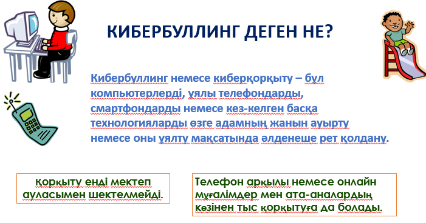 1 Балалар, кейде сендер өздерің білместен агрессор немесе кибербуллер болуларың мүмкін. Кибербуллерлер – бұл өз құрбанын қудалау және келемеждеу үшін кез-келген девайсты (телефон планшет, компьютер, т.с.с.) қолдануы мүмкін агрессорлар. |