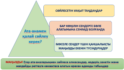 Балалар, жауаптарыңа рақмет! Өз тәжірибелеріңмен және ойларыңмен бүкіл топпен бөліскендерің керемет. Барлығысыз үшін ата-анамызбен сөйлесу оңай емес. Бірақ, сөйлесуде көмек бола алатын бірқатар әрекеттер жасай аласыңдар. Сөйлесу үшін ата-аналарың бар көңілін сендерге бөле алатынына өздерің сенімді болатын уақытты таңдаңдар. Мәселе сендер үшін қаншалықты маңызды екенін түсіндіріңдер. Естен шығармаңдар, олар ақпараттық технологияларды соншалық жақсы білмеуі мүмкін, сондықтан, не болып жатқанын түсіну үшін сендердің көмектерің қажет болуы ықтимал. Олар сендерге бірден жауап бере алмауы мүмкін, бірақ, көмектекісі келер, сонда бірігіп шешім таба аласыңдар. Бір бастан екі бас әлдеқайда артық! Егер әлі не істейтіндеріңді білмесеңдер, өздерің сенетін басқа адамдармен сөйлесу жағын қарастырыңдар. Сендердің қамдарыңды ойлайтын және көмектескісі келетін адамдар өздерің ойлағаннан әлдеқайда көп! |