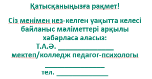 1 Егер қойылмаған сұрақтарың қалса немесе көмек керек болса, менімен (мектеп психологымен немесе колледж психологымен) хабарласыңдар. |