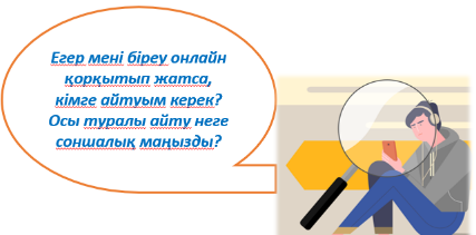 6 Егер мені біреу онлайн қорқытып жатса, кімге айтуым керек? Осы туралы айту неге соншалық маңызды? Келіңдер, бірге ойланып, осы сұраққа жауап беріп көрейік. Жауаптарыңды чатқа жазыңдар. |