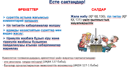 1 Балалар, сендер есейіп келесіңдер және қазірден бастап-ақ өз мінез-құлықтарыңды қадағалап, басқарып отыруларың тиіс. Кез-келген зорлық-зомбылық түрінің, соның ішінде, буллинг пен кибербуллинг құрбаны болған адамдар әділ сот жүргізілуіне және құқық бұзушыны жауапқа тартуға құқылы. Сендер әрбір әрекеттерің үшін жауаптысыңдар. Ал сендер жасөспірім болғандықтан, сендер үшін ата-аналарың жауапты, ал аталмыш әрекеттер үшін қылмыстық жауапкершілікке тартылуға болады. Ешқашан ұмытпаңдар, әр істің салдары болады. |