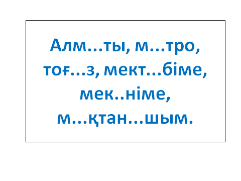 -Балалар, біз кеше қандай тақырып өттік? -Буын -Балалар тақтаға қарайықшы -Қандай көлік түрлерін көріп тұрсыңдар? -Балалар, қандай көлік түрлерін білесіңдер? -Оқушылардың жауаптары (көлік түрлерін атайды) Ойын: «Не артық?» (Ұшақ,зымыран,тікұшақ,метро) Оқушы жауаптарын құптай отырып, бүгінгі сабактың тақырыбы Буын, «Алматы метросы» мәтіні деп аталатынын хабарлап, метро жайлы видео, қосымша ақпарат беріледі. Видео: Алматы метросы Алматыдағы метро 2011 жылдан бастап пайдалануға берілді. «Мәскеу», Сайран», «Алатау», «Байқоңыр», «Абай», «Алмалы»,«Жібек жолы», «Райымбек батыр», «Мұхтар Әуезов атындағы драма театры» бекеттері бір- бірінен өзгеше. Күту алаңдары кең, жарық, таза. 9 бекеттің 8-інің атауы ұлттық тарихи даму дәстүріне сай қойылған. Бүгінгі сабағымыз ерекше, саяхат сабағы болмақ. АЛМАТЫ қаласына метромен саяхатқа шығамыз. - Ал саяхатқа шығу үшін біздің қолымызда не болуы керек? -Билет - Дұрыс айтасыңдар, ендеше мен сендерге қазір метроға кіру билетін таратып беремін. -Бірақ,бұл билетті білімдеріңмен аласыңдар.(Сұрақ-жауап) - Метроға отырып, саяхатымызды бастайық. 1- бекет «Мәскеу» 1-тапсырма: Оқулықпен жұмыс Оқылым. «Алматы метросы» мәтінін оқып беріп, мазмұнын сұрау 2- бекет « Райымбек» 2-тапсырма: «Фишка» ойыны Туыстық атауларды фишкамен сөз құрап,буынға бөлу. 3- бекет «Жібек жолы» 3-тапсырма: Дәптермен жұмыс Көркем жазу. О О О О О О О о о о о о о о Оқулықтағы 2-жаттығу Өткен ережелерді естеріне түсіру үшін сөздерді буынға бөлгізіп, талдату. Берілген өлеңді көшіріп жазады. Алматы, метро, мекен сөздерін буынға бөліп айтады. Сөзде қанша буын, неше дауысты және дауыссыз дыбыс бар екенін айта отырып, өткен ережелерді естеріне түсіреді 4- бекет «Алмалы» 4-тапсырма:Сергіту сәті 5- бекет « Абай» 5-тапсырма: «Буындардан сөз құра» Берілген буындардан сөздер құрап жаз. Кірпі, балық, аққу, торғай, күшік.