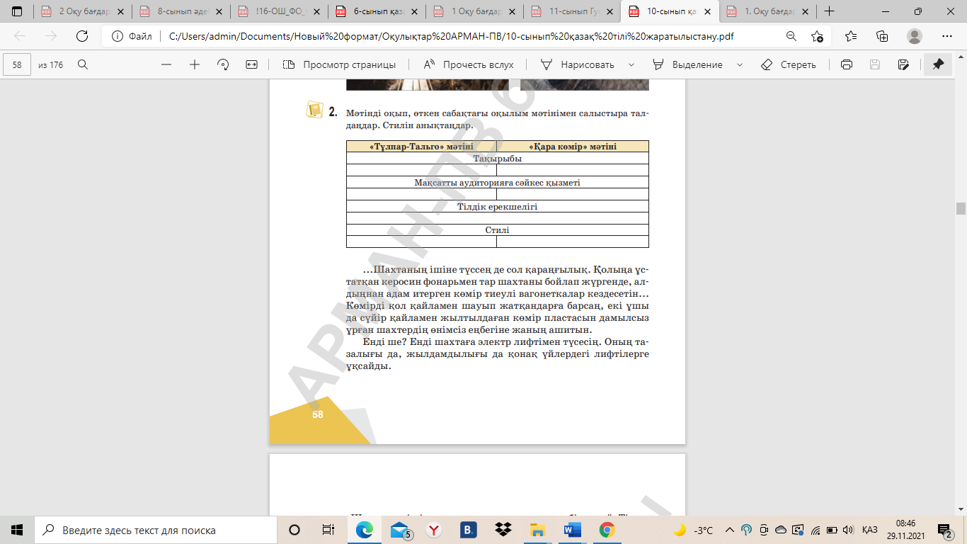 ІІ. ОҚЫЛЫМ ТАПСЫРМАСЫ. Мағынаны тану.Екі мәтінді салыстыра оқыңдар, қолданылған тілдік құралдар арқылы стилін анықтаңдар. 1-мәтін
