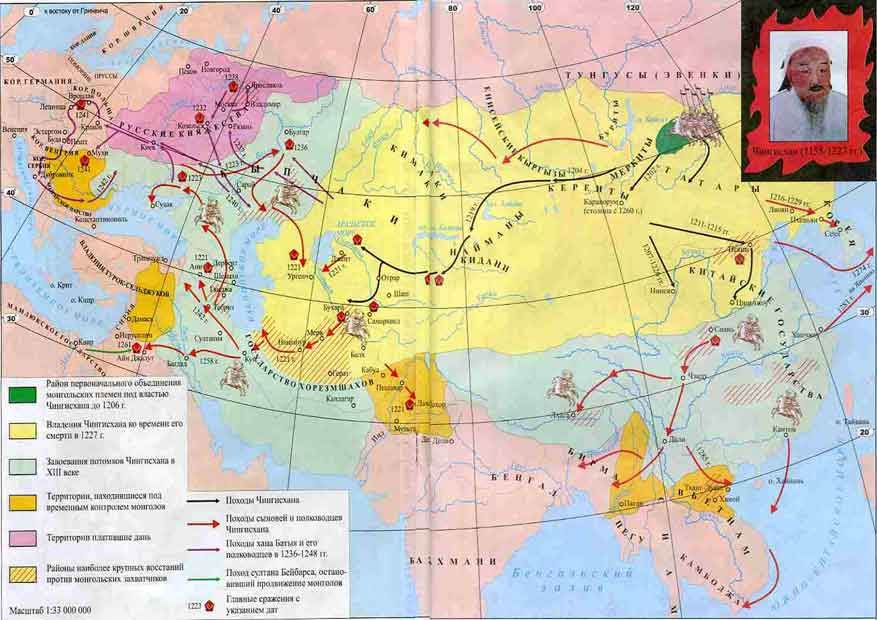 В 1218-1219 гг. Чингисханом были покорены народы Сибири (якуты, буряты). Енисейские кыргызы. Уйгурское и Турфанские княжества в Восточном Туркестане сдались без боя.