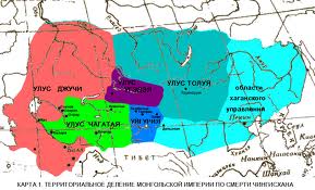 После завоевания, территорию Казахстана Чингисхан разделил на улусы между сыновьями. Территория Казахстана вошла в состав трех объединений: