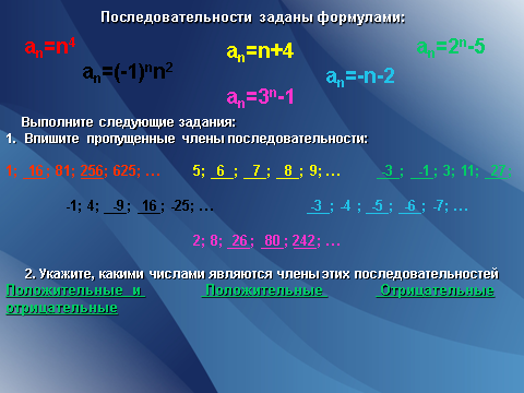 Даны последовательности: аn=n4 ; аn=(-1)nn2 ; аn=n +4; аn=-n-4; аn=2n -5; аn=3n -1. Задание для учеников 1 группы: Последовательности заданны формулами. Впишите пропущенные члены последовательности: 1; ___; 81; ___; 625; ... -1; 4; ___; ___; -25; … 5; ___; ___; ___; 9; … ___; -6; ___; ___ ; -9; … ___; ___; 3; 11; ___; … 2; 8; ___; ___; ___; … Задание: Выписать первые пять членов последовательности, заданной формулой своего n-ого члена. Задание для учеников группы: Определите, какими числами являются члены этих последовательностей, заполните таблицу. Положительные и отрицательные числа Положительные числа Отрицательные числа Работа с учебникам № 148 , № 151