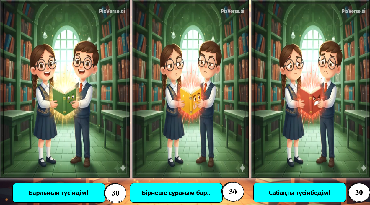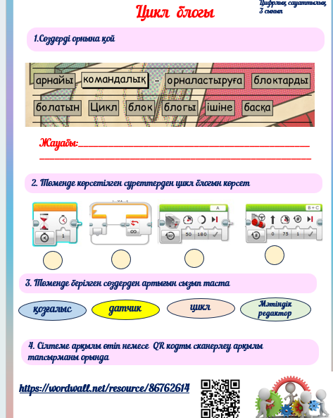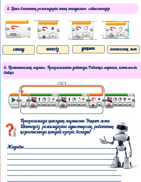 Жаңа ақпаратты тыңдайды, сұрақтарға жауап береді Жұмыс парағы бойынша тапсырмаларды орындайды. Дескрипторлар: - сөйлемді құрастырады - блокты анықтайды - артығын сызып тастайды -интерактивті тапсырманы орындайды Сергіту жаттығуларын орындайды - сәйкестендіру тапсырмасын орындайды - роботқа арналған программаны құрады -сұрақтарға жауап береді Тұжырымдардың қайсы дұрыс,қайсы қате екенін анықтайды |