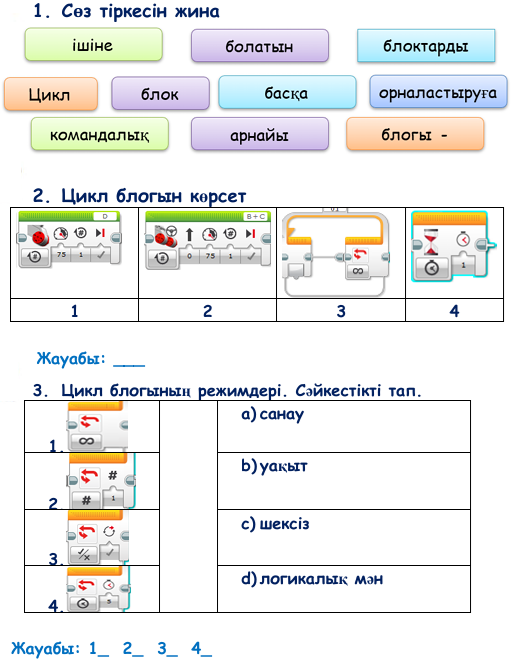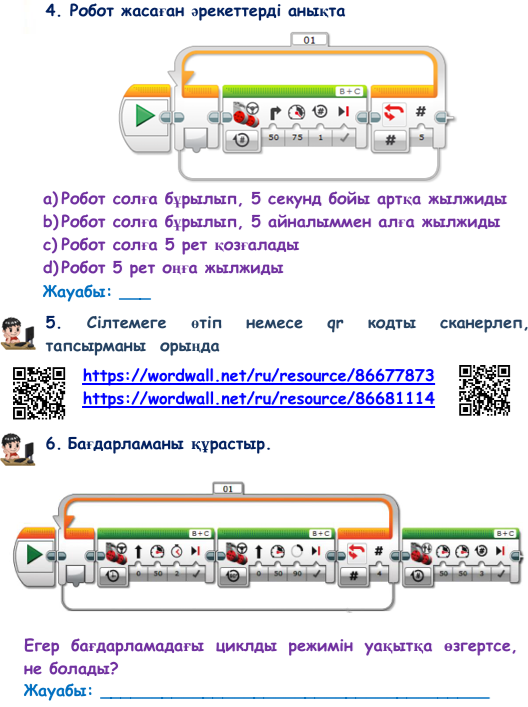 1. Бағдарламада қандай цикл режимі қолданылады? 2. Бағдарламаны орындау кезінде роботтың қозғалыс алгоритмі қандай? 3. Егер біз бағдарламадағы циклды режимдерге өзгертсек, Робот қозғалысында не өзгереді уақыт және шектеусіз? Білімді бекіту, жұмыс парағымен жұмыс