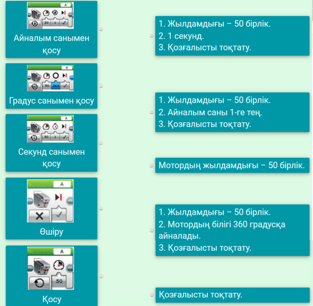 Жаңа ақпаратты тыңдайды, сұрақтарға жауап береді Тапсырманы топпен орындайды Жұмыс парағы бойынша тапсырмаларды орындайды. Дескрипторлар: - сөйлемді құрастырады - блокты анықтайдф - сәйкестікті белгілейді Сергіту жаттығуларын орындайды - дұрыс жауапты таңдайды - интерактивті тапсырманы орындайды - роботқа арналған программаны құрады |