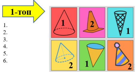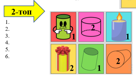 бөлінеді. Оқушылар айналу денелерінің түрлерін, оның ішінде цилиндрдің элементтерін атайды. 1-топ