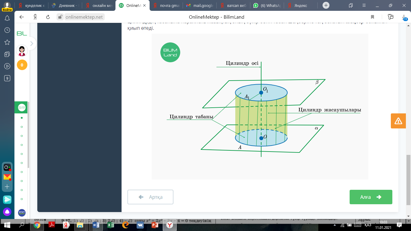 11.1.7- цилиндрдің анықтамасын, оның элементтерін білу, цилиндрді жазықтықта кескіндей алу; 11.3.4- цилиндрдің бүйір және толық бетінің аудандары формулаларын қорытып шығару және оларды есептер шығаруда қолдану; 11.3.5-айналу денелерінің (цилиндр, конус, қиық конус, шар) элементтерін табуға есептер шығару; 11.1.11-көпжақтар мен айналу денелерінің жазбаларын жасай алу; |