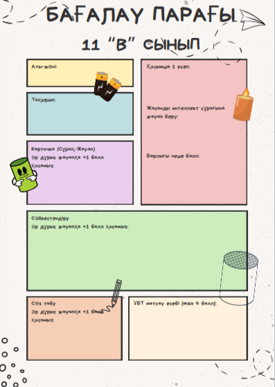 Оқушыларды бағалау: 3 оқушы – 10 балл 4 оқушы – 9 балл 4 оқушы – 8 балл 1 оқушы – 7 балл |