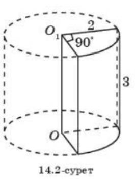 №25.10 есеп 14.2-суреттегі цилиндрдің табанының радиусы 2см-ге, ал жасаушысы 3см-ге тең. Осы цилиндрден екі жақты тік бұрыш жасап, қиылып алынған бөлігінің көлемін табады