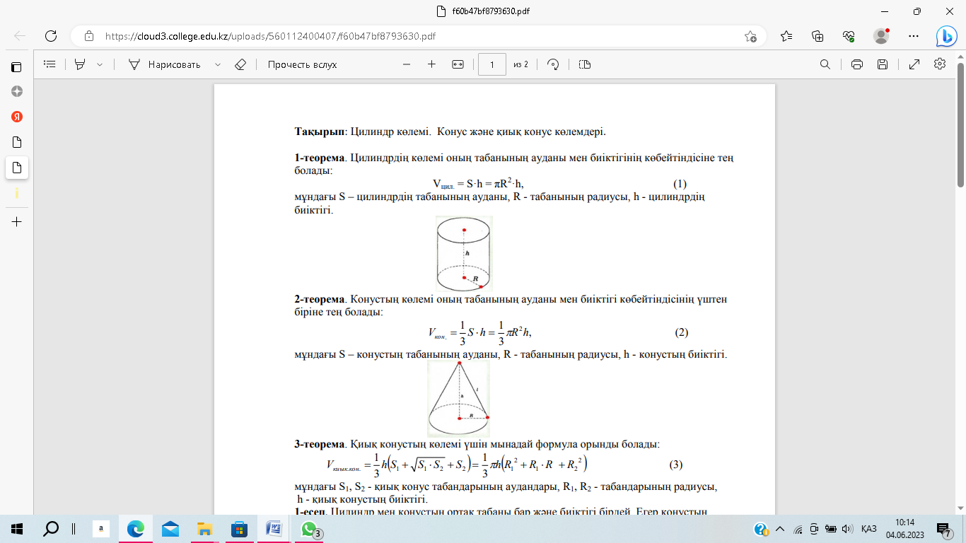 3-тапсырманы орындатады, бақылайды, мысал, үлгі көрсетеді.1-есеп №25.10 есеп 14.2-суреттегі цилиндрдің табанының радиусы 2см-ге, ал жасаушысы 3см-ге тең. Осы цилиндрден екі жақты тік бұрыш жасап, қиылып алынған бөлігінің көлемін табады Қосымша 3 да беріледі.