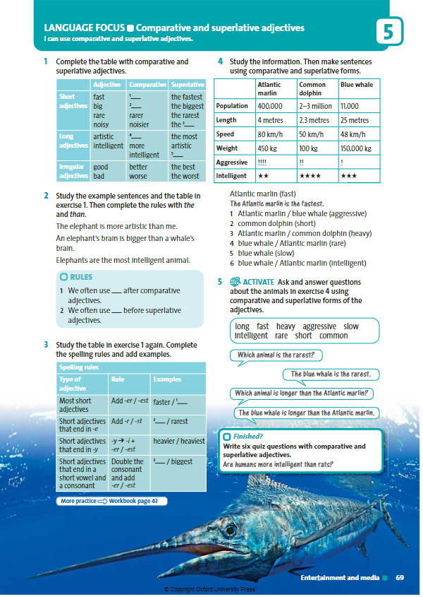 Descriptor: - learn comparative and superlative forms of adjectives - complete the table 2 points Descriptor: - study the example sentences and the table - make sentences using comparative and superlative adjectives 2 points Descriptor: - study the example sentences and complete the rules 1 point Descriptor: - make sentences using information from the box - write and read the sentences -can make their own sentences 3 points |