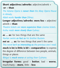 •Short adjectives/adverbs with “-er” + “than” (e.g., “Aibek works harder than Dilnaz”).