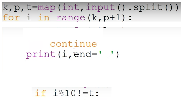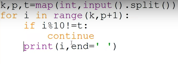 К мен Р аралығындағы барлық соңғы цифры t-ға тең сандарды экранға шығаратын программа кодын құрастыр.