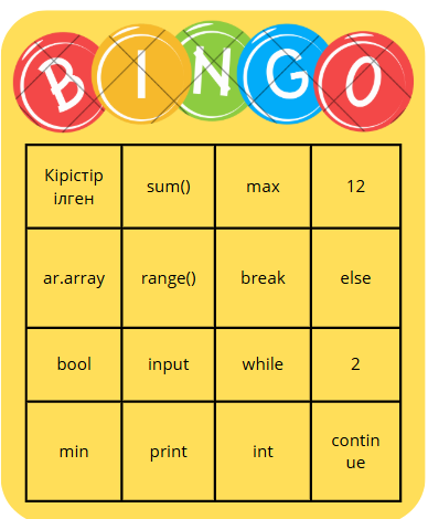 Ұйымдастыру кезеңі: Сәлеметсіздер ме, оқушылар! Бүгінгі сабағымызға дайындалып, барлығымыз орындарымызға жайғасайық. Сабақта кім бар, кім жоқ екенін түгендеп алайық. Өткен тақырыпты қайталау: Балалар, өткен сабақта біз continue операторын талқыладық. Енді сол білімімізді тексеру үшін «Бинго» ойынын ойнаймыз. Әрқайсыңызға 4x4 тор көзден тұратын Бинго картасы таратылады. Мен сіздерге сұрақтар немесе сипаттамалар оқимын, ал сіздер сол терминдерді тауып, белгілейсіздер. Кім бірінші тігінен, көлденеңінен немесе диагональ бойынша қатарды толтырса, «БИНГО!» деп айтады. «Бинго» әдісі сұрақтары: 1. Циклдің белгілі бір итерациясын өткізіп жіберетін оператор қандай? 2. Цикл ішіне тағы бір цикл енгізу қалай аталады? 3. Циклде диапазонды орнату үшін қандай функция қолданылады? 4. Python-да белгілі бір шарт орындалғанға дейін орындалатын цикл түрі қандай?